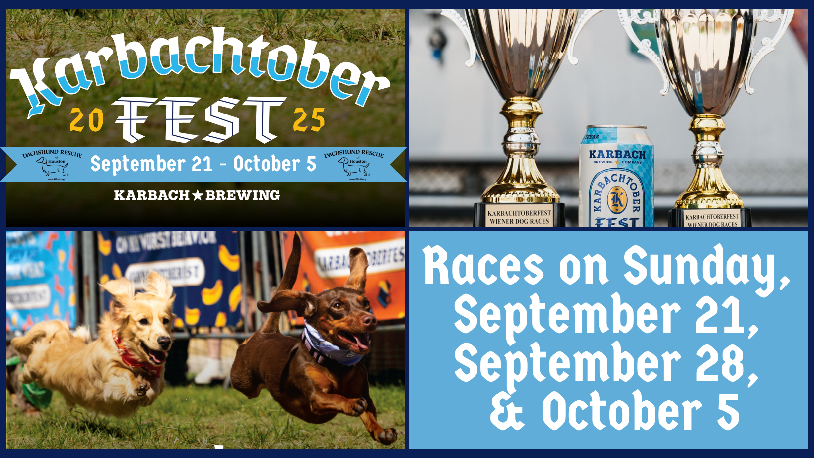 Click here for more information Karbachtoberfest 2025: Wienerdog Racing Series Sunday September 21st, 2025 1:00 PM until 04:30 PM Location: Karbach (713) 680-8886 Map: 2032 Karbach St. Houston TX 77092 See all of the animals attending this event.